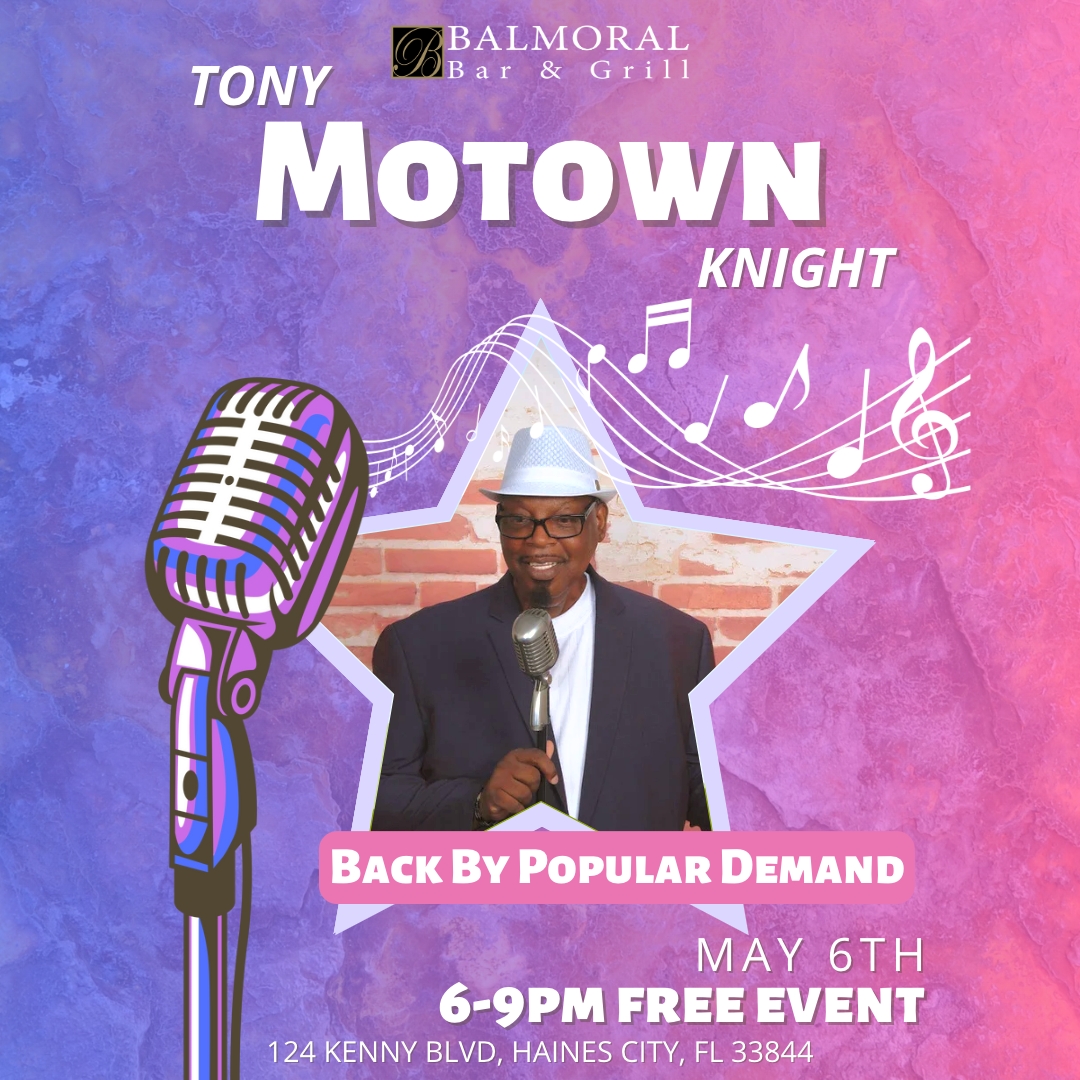 We are so excited to have popular performer Tony “Motown” Knight returning to Haines City’s live music venue to do what he does best — entertain a crowd.